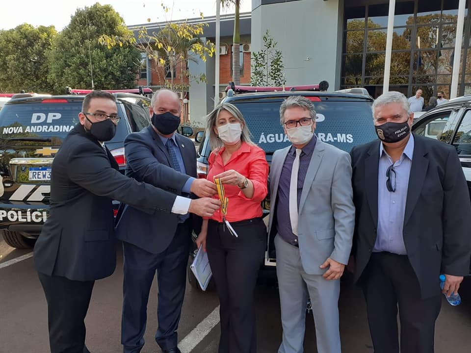 A Prefeita Gerolina Alves participou nesta segunda-feira (26) de julho, da solenidade de entrega e aquisição de 31 novas viaturas distribuídas para alguns municípios do Estado, foram entregues para a Polícia Militar e Polícia Civil de Mato Grosso do Sul pelo Governo do Estado Reinaldo Azambuja, por meio da Secretaria de Estado de Justiça e Segurança Pública, dentre elas; uma nova viatura para a Delegacia de Polícia Civil de Água Clara-MS, que irá reforçar a segurança pública do município.