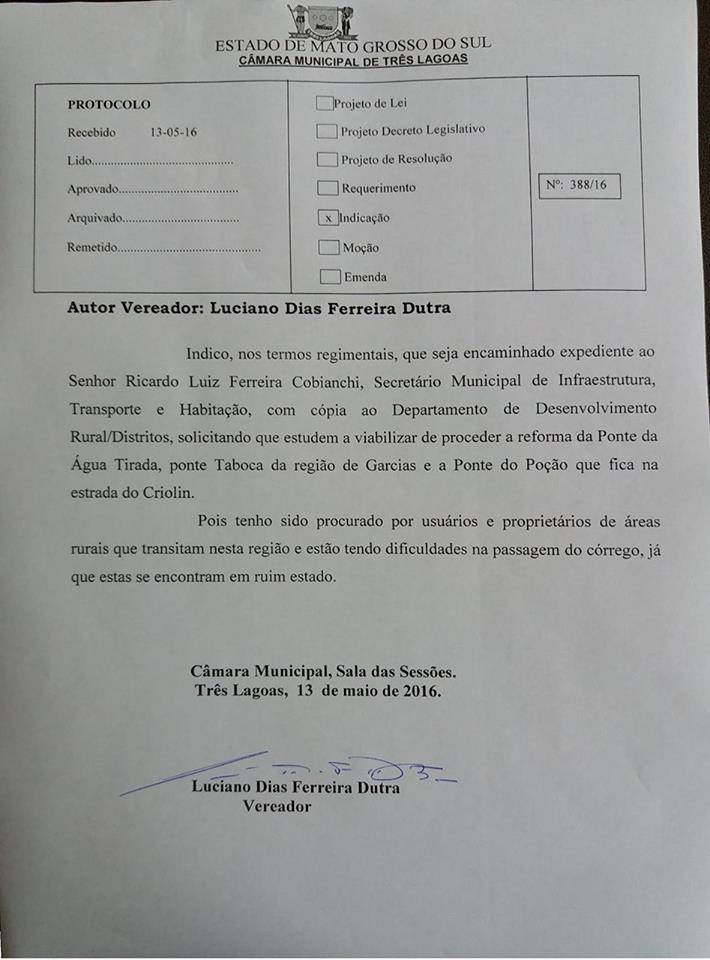 O Vereador Luciano Dutra solicitou à Secretaria de Infraestrutura Urbana, Transporte e Habitação, e ao Departamento de Desenvolvimento Rural e Distritos que estudem a viabilidade de proceder a reforma da Ponte da Água Tirada, Ponte Taboca – da região de Garcias – e Ponte do Poção que fica na estrada do “Criolin” no Distrito de Arapuá.