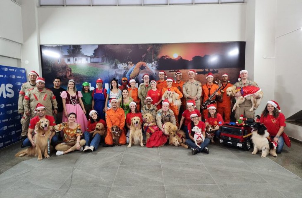 Militares do Corpo de Bombeiros de Mato Grosso do Sul, voluntários e os cães co-terapeutas estiveram, nesta quinta-feira (19), no HRMS (Hospital Regional de Mato Grosso do Sul) para visitar e entregar brinquedos às crianças internadas nas alas pediátricas.