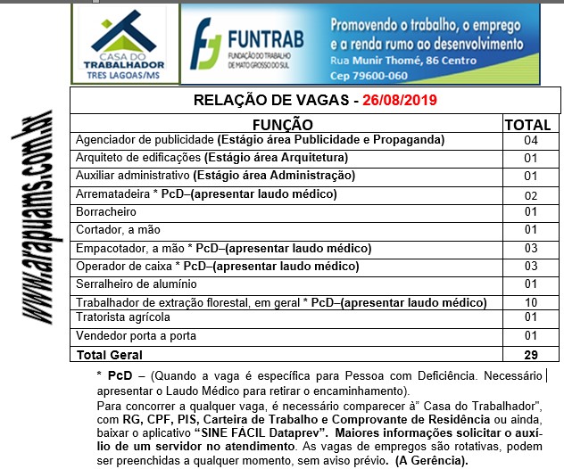 A Casa do Trabalhador de Três Lagoas divulgou ao ArapuáMS, 29 vagas de empregos disponíveis por intermédio da unidade nesta segunda-feira (26) de agosto de 2019 no município de Três Lagoas/MS.