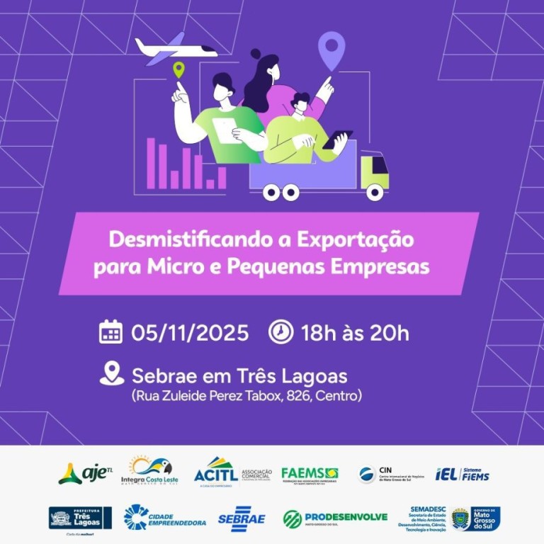 A Prefeitura de Três Lagoas, por meio da Secretaria Municipal de Desenvolvimento Econômico, Ciência, Tecnologia e Turismo (SEDECT) é parceira do SEBRAE no workshop “De Pequeno a Global: Desmistificando a Exportação para Micro e Pequenas Empresas”, que será realizado nesta quarta-feira, 05 de novembro de 2025, às 18h, no SEBRAE Costa Leste, localizado na Rua Zuleide Perez Tabox – 826 – Centro.