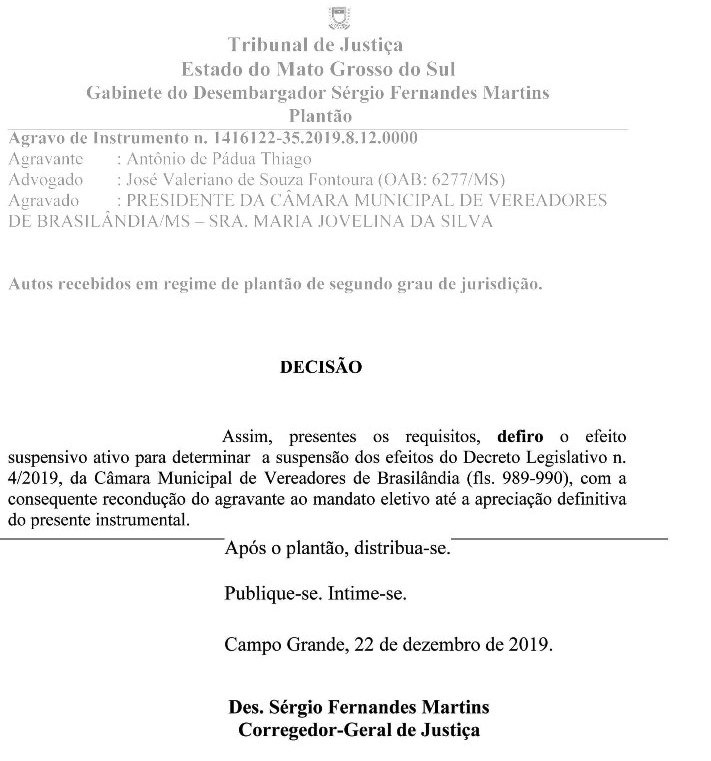 O pedido para anular o decreto legislativo foi registrado no último sábado (21) e recebido pela equipe plantonista do judiciário. Conforme o trecho da decisão assinada pelo desembargador “Assim, defiro o efeito suspensivo ativo para determinar a suspensão dos efeitos do Decreto Legislativo n. 4/2019, da Câmara Municipal de Vereadores de Brasilândia (fls. 989-990), com a consequente recondução do agravante ao mandato eletivo até a apreciação definitiva do presente instrumental. Intime-se o agravado com urgência, servindo a cópia da presente decisão como mandado. Após o plantão, distribua-se”.