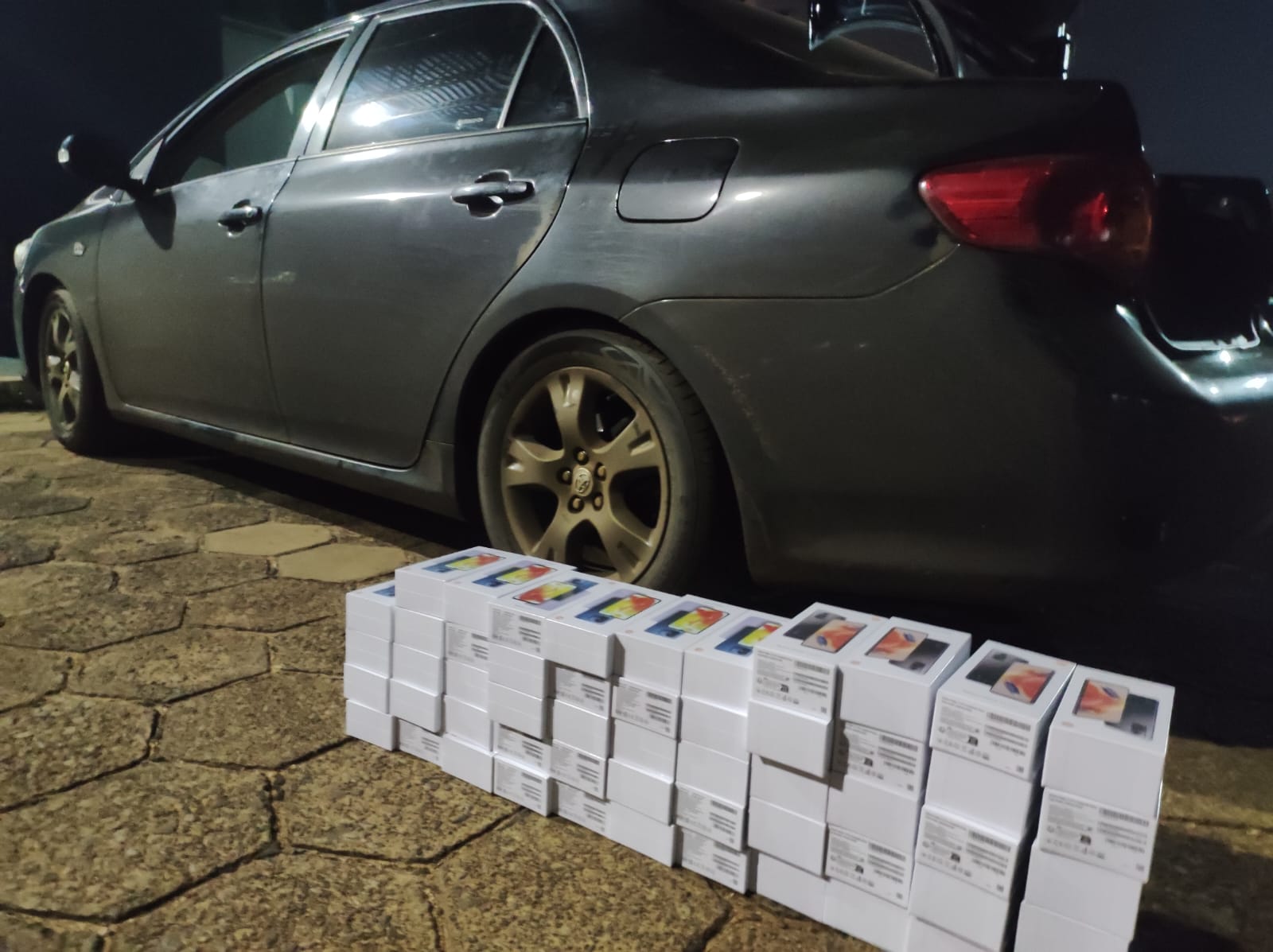 Pelo fato dos aparelhos serem de origem estrangeira e não possuir nota fiscal ou qualquer outro tipo de desembaraço aduaneiro, a mercadoria e o veículo Toyota Corolla juntamente com a autora foram encaminhados para o 4° BPM, onde a mercadoria foi conferida, sendo (vinte) 20 telefones celulares da marca Xiaomi modelo Note 12 Pro, e (trinta e quatro) 34 telefones celulares da marca Xiaomi modelo Redmi 12C, totalizando 54 (cinquenta e quatro) telefones celulares.