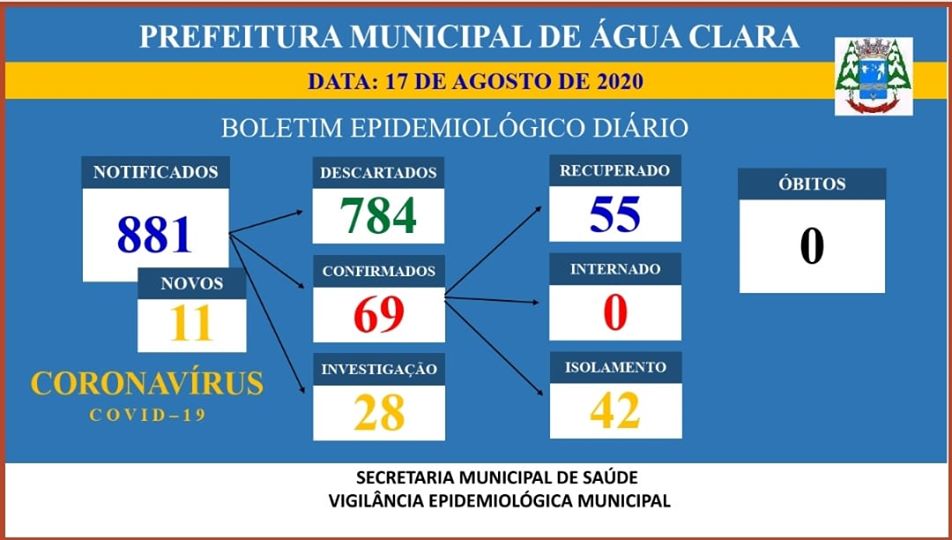 De acordo com o último Boletim Epidemiológico Diário, divulgado nesta segunda-feira (17) pela Vigilância em Saúde de Água Clara, o município tem quatro novos casos positivos do novo coronavírus.