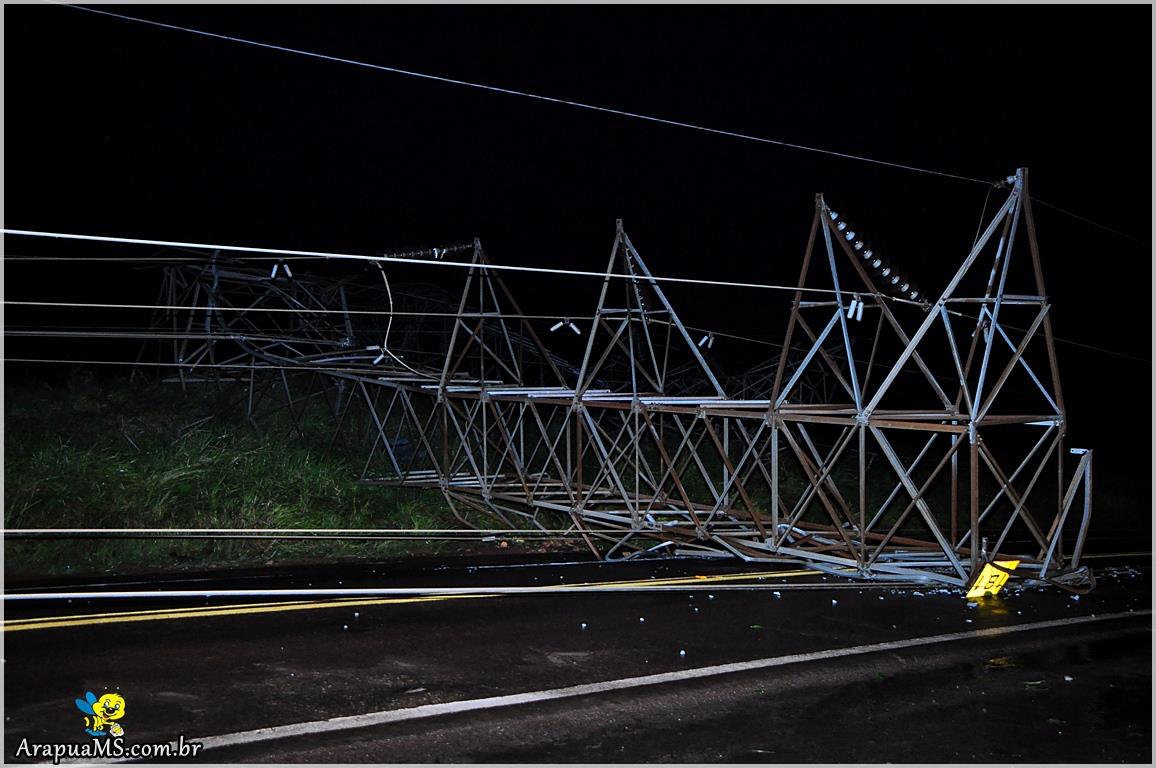Com a força do vento oito torres da linha de energia foram ao chão e duas foram parcialmente destruídas durante a tempestade que ocorreu na região entre Três Lagoas e Água Clara, em frente ao Distrito de Garcias.