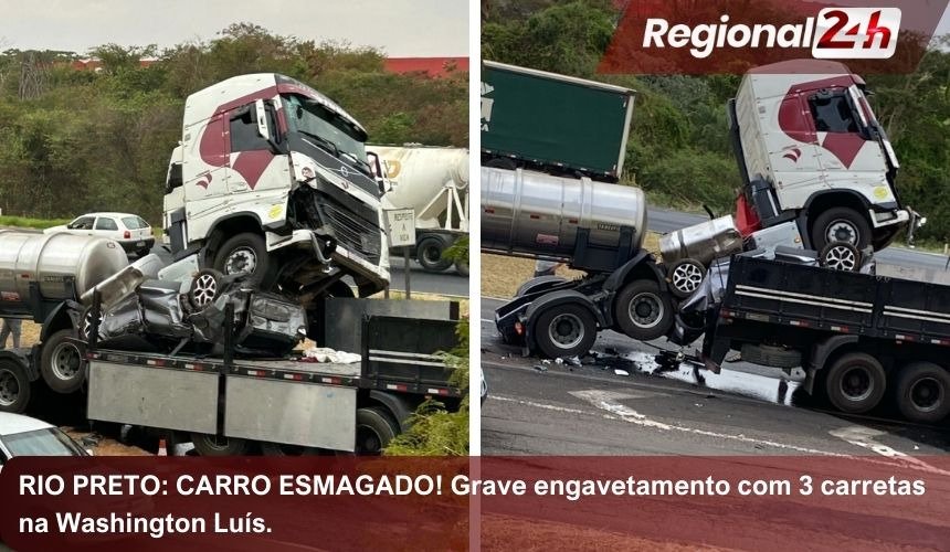 Em Rio Preto/SP| Carro é esmagado por engavetamento com carretas e deixa um morto Washington Luís na SP-310