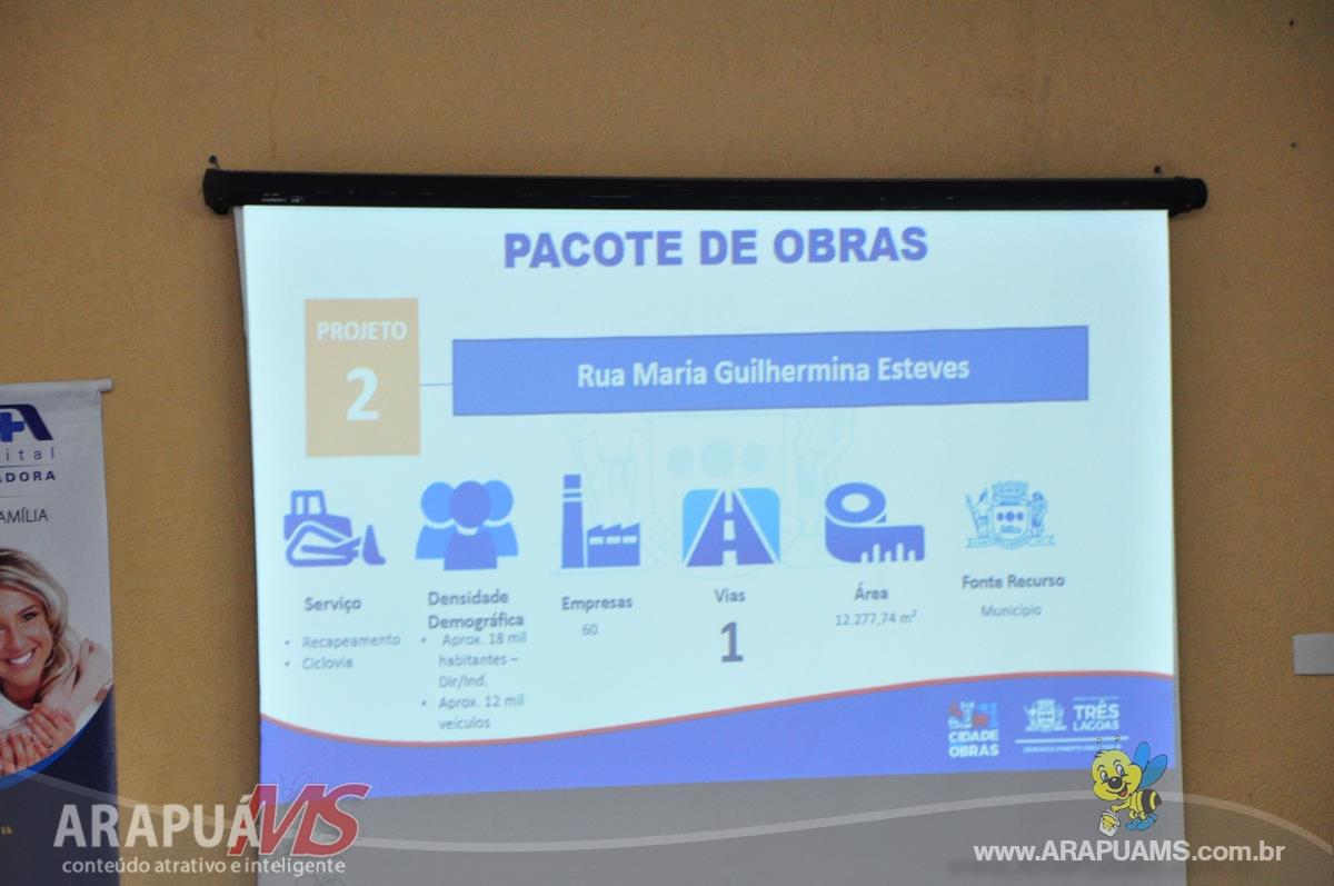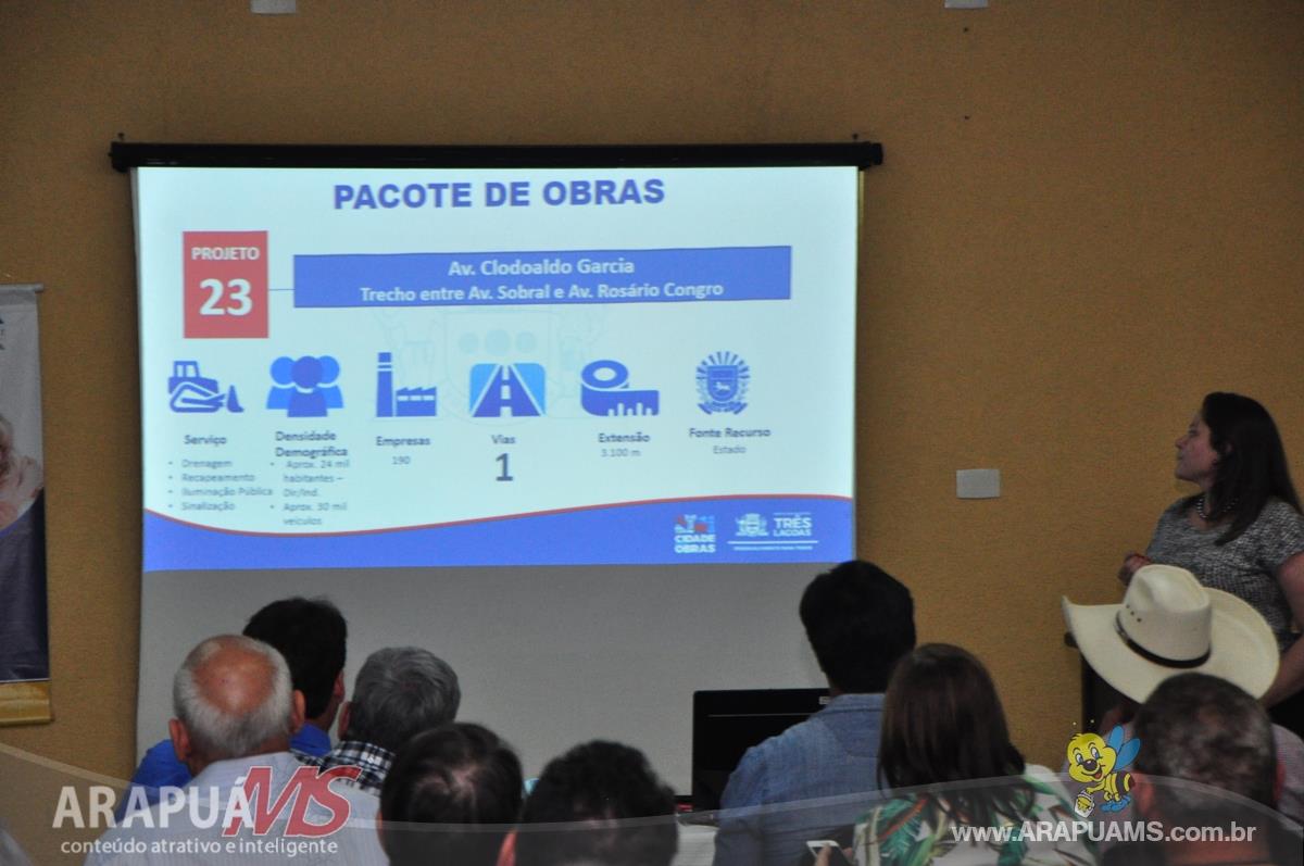 O assunto foi referente as obras de revitalização e reurbanização da Avenida Clodoaldo Garcia, que vai da rotatória da BR 262 até a antiga linha férrea. A obra terá restauração funcional do pavimento (recapeamento), drenagem de águas pluviais, canteiro central e iluminação pública. A obra total terá o valor de mais de R$ 3 milhões.