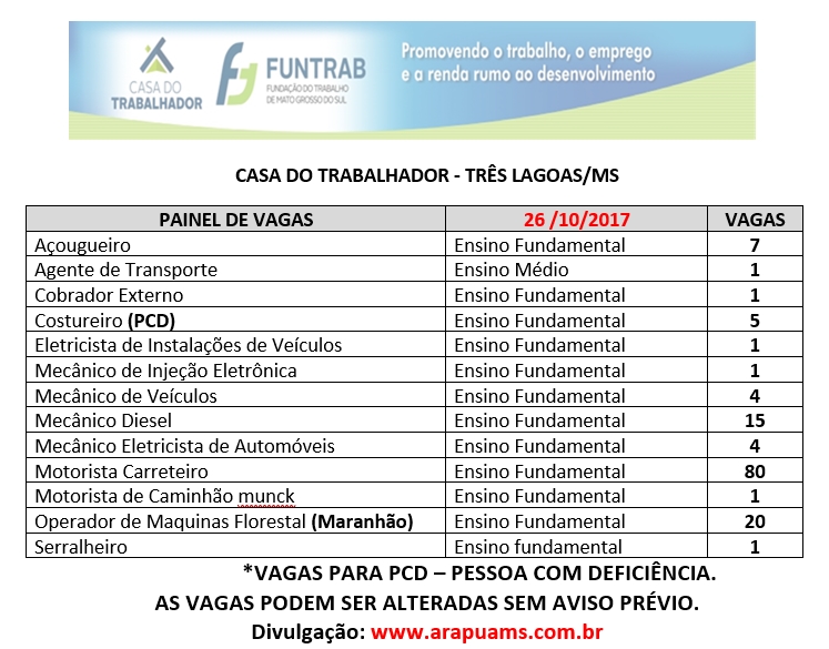 A divulgação é feita em parceria ArapuáMS com o Casa de Trabalhador de Três Lagoas. O horário de atendimento é das 07h às 13h na Rua Munir Thomé, nº 86 no Centro de Três Lagoas.