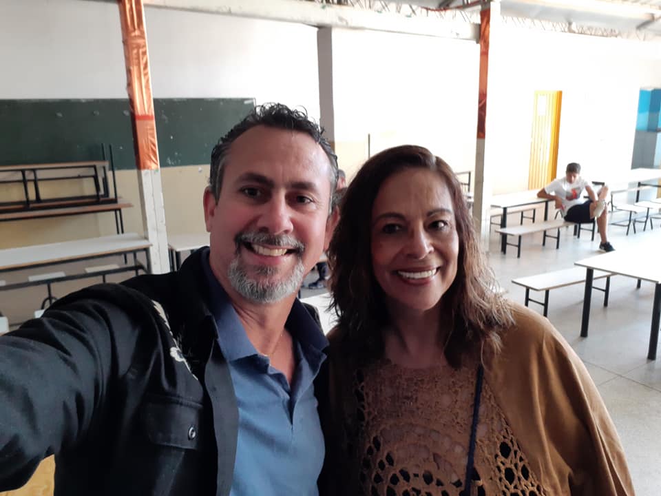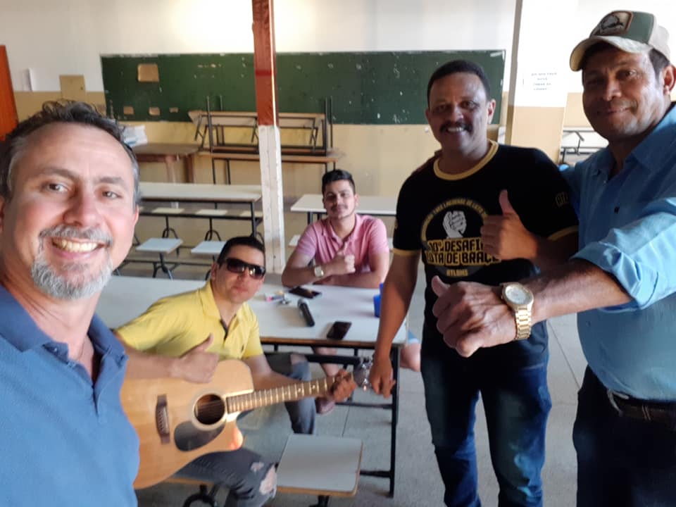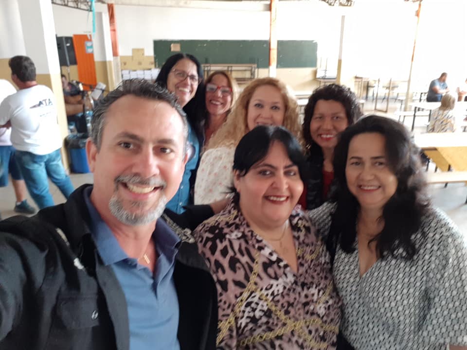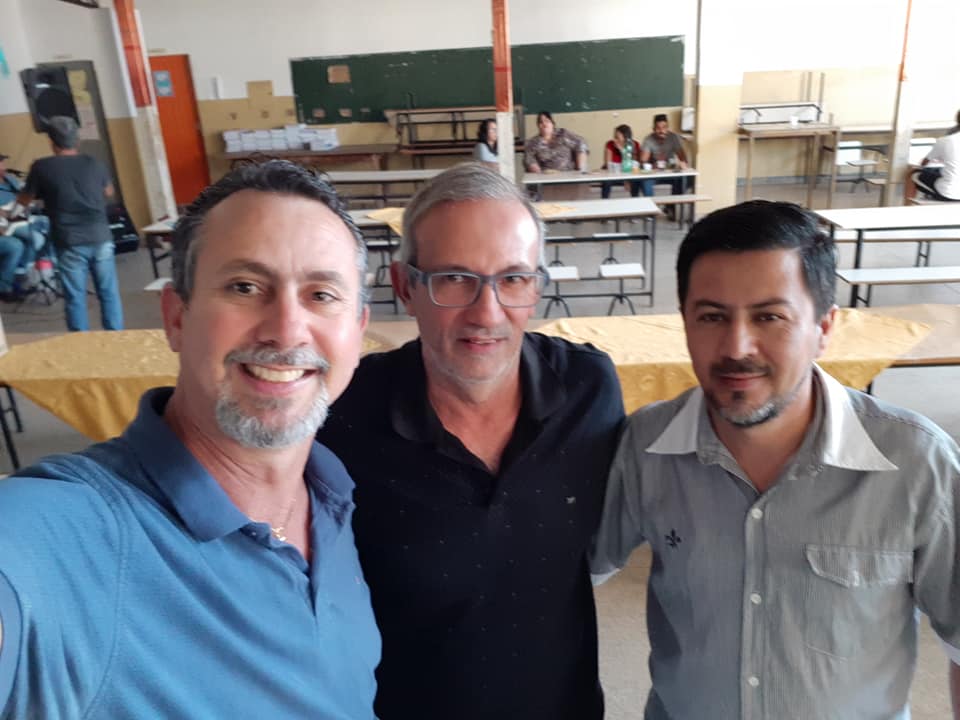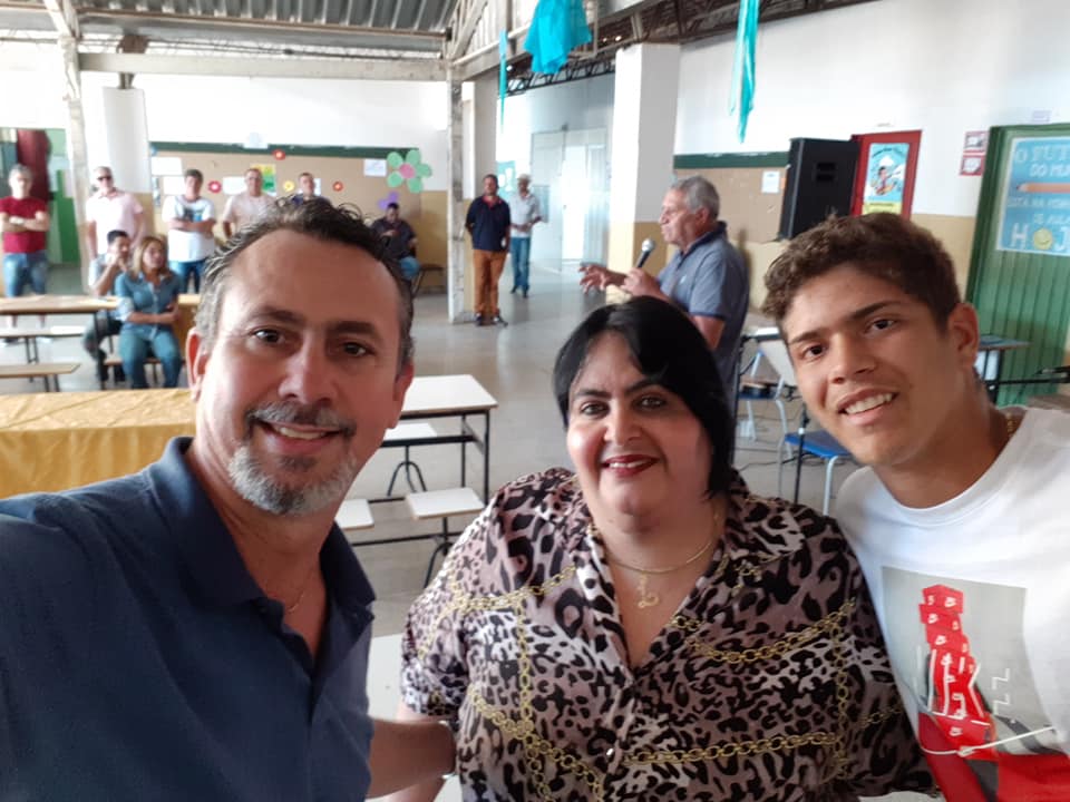 Frente a Escola Municipal Maria Eulália Vieira, que levou a representatividade do esporte em nível estatual em 2018, nos Jogos Escolares de Mato Grosso do Sul, está o diretor Lélis Rocha Dias que recebeu os 39 convidados, entre professores, esportistas e treinadores ícones do esporte de Três Lagoas.