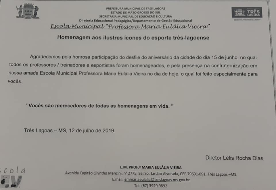 Escola Municipal Profª Maria Eulália Vieira presta homenagem aos ícones do esporte de Três Lagoas