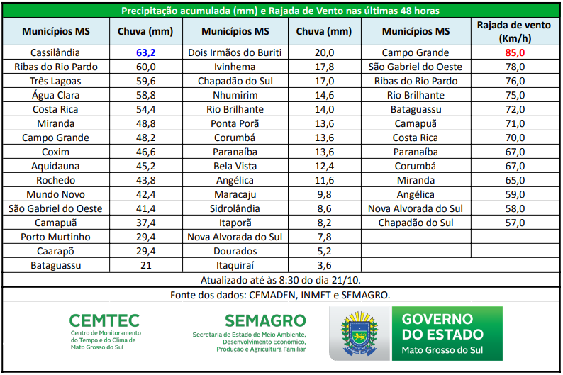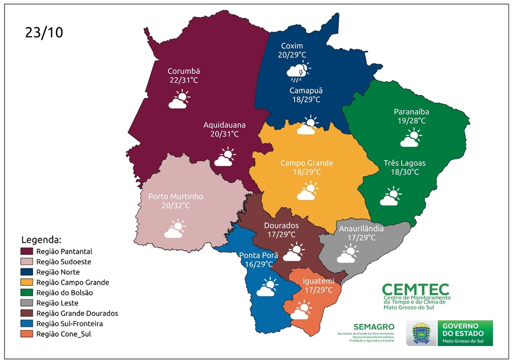 A próxima atualização da previsão do tempo será feita dia 23/10 (áudio) e 24/10 (PDF) e para maiores informações sobre o tempo em Mato Grosso do Sul acompanhe os boletins diários do tempo através do link: https://www.cemtec.ms.gov.br/informativo-do-tempo/.