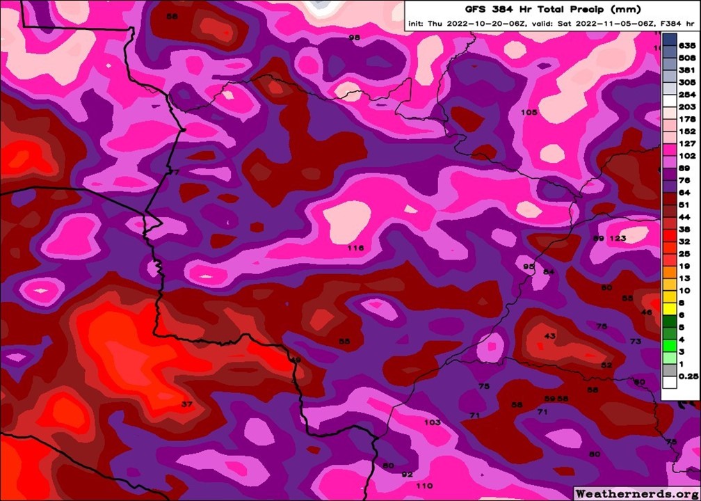 Figura 1. Precipitação acumulada prevista entre os dias 20 de outubro a 05 de novembro de 2022. Fonte: Modelo GFS/Weathernerds.