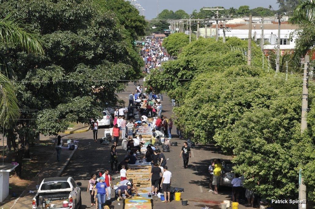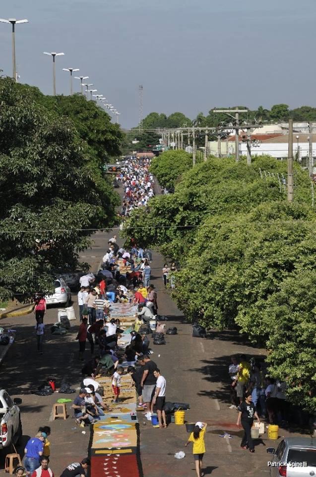 Os desenhos são formados com pó de serra, madeira, flores, pedras, dentre outros itens. As imagens são desenhadas em papel pardo sobrepostas em tecidos para facilitar o preenchimento dos desenhos e a limpeza após a procissão. Que inicio na frente da Catedral Sagrado Coração de Jesus (Matriz) e finalizou em frente da Igreja de Santo Antonio em frente a praça Ramez Tebet, na Avenida Antonio Trajano que foi interditada cerca de seis quarteirões em quase todo seu trajeto, o grupo Jovens na Orientação para Vivência Sacramental (Jovisa) e participantes das cinco paróquias da cidade ajudaram na coordenação da montagem.