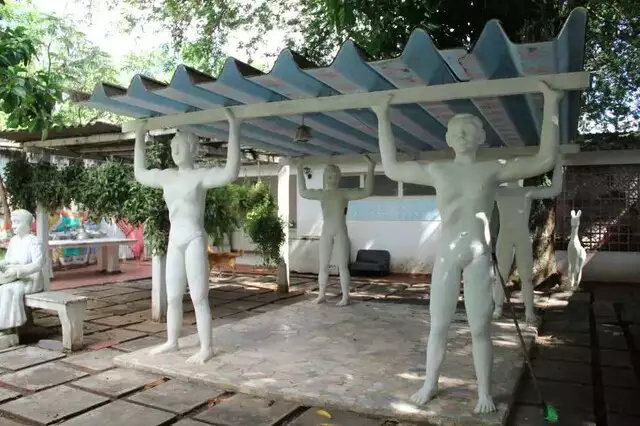Os pilares da antiga oficina são sustentados por quatro homens em concreto, que representam as pessoas mais importantes da sua vida: o marido e os três filhos.