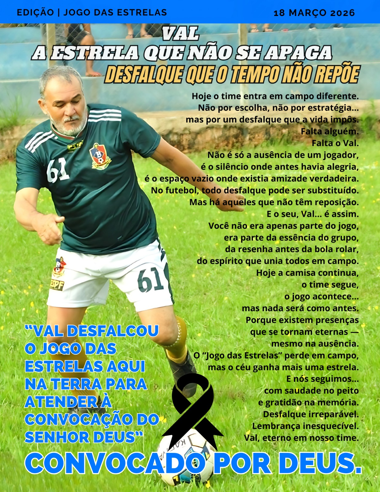 Nos últimos dias, a comunidade tem sentido o peso de perdas irreparáveis, e a partida de Val soma-se a esse momento de grande comoção. Homem querido, ele será lembrado com carinho por todos que tiveram o privilégio de conviver com sua presença acolhedora e seu jeito humilde.