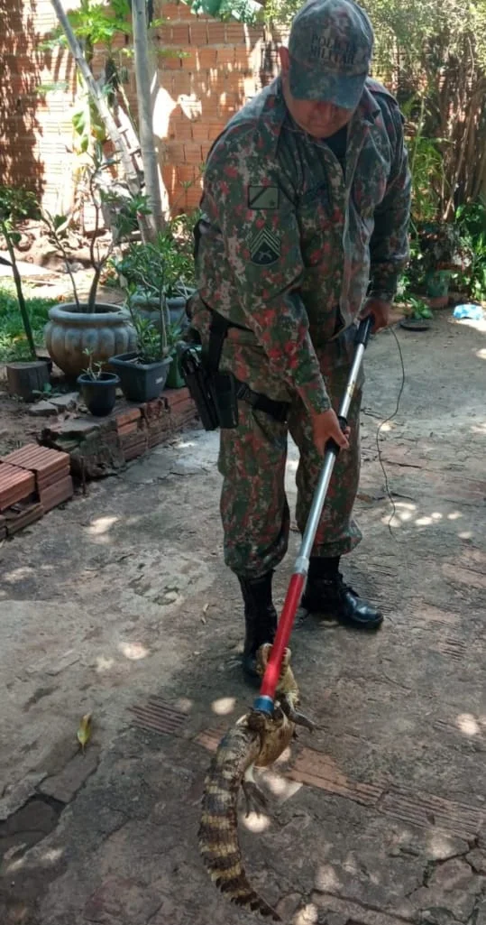 Polícia Militar Ambiental de Miranda captura jacaré em residência no centro da cidade