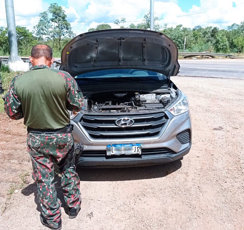 Uma equipe da Polícia Militar Ambiental de Miranda realizava fiscalização ambiental no início da tarde de (12) de abril, na BR 262 e, próximo à cidade, avistou dois homens ao lado de um veículo Hyundai Creta com o capô aberto, à margem da rodovia. Os Policiais pararam para ajudar e perceberam muito nervosismo nos homens. Então, os Policiais começaram a conversar com ambos separadamente, que passaram a dar informações totalmente desencontradas, inclusive, sobre a propriedade do veículo.