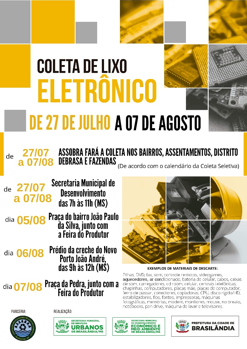 A Prefeitura de Brasilândia realizará, a partir do próximo dia 27, a quarta edição da Campanha de Coleta de Lixo Eletrônico. A ação contará com a parceria da Associação Brasilandense dos Agentes Ambientais (ASSOBRAA).