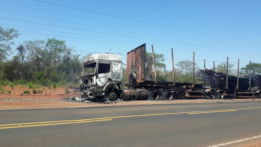 Próximo de Água Clara, Carreta carregada de eucaliptos pega fogo na BR 262, e incêndio é combatido por Bombeiros