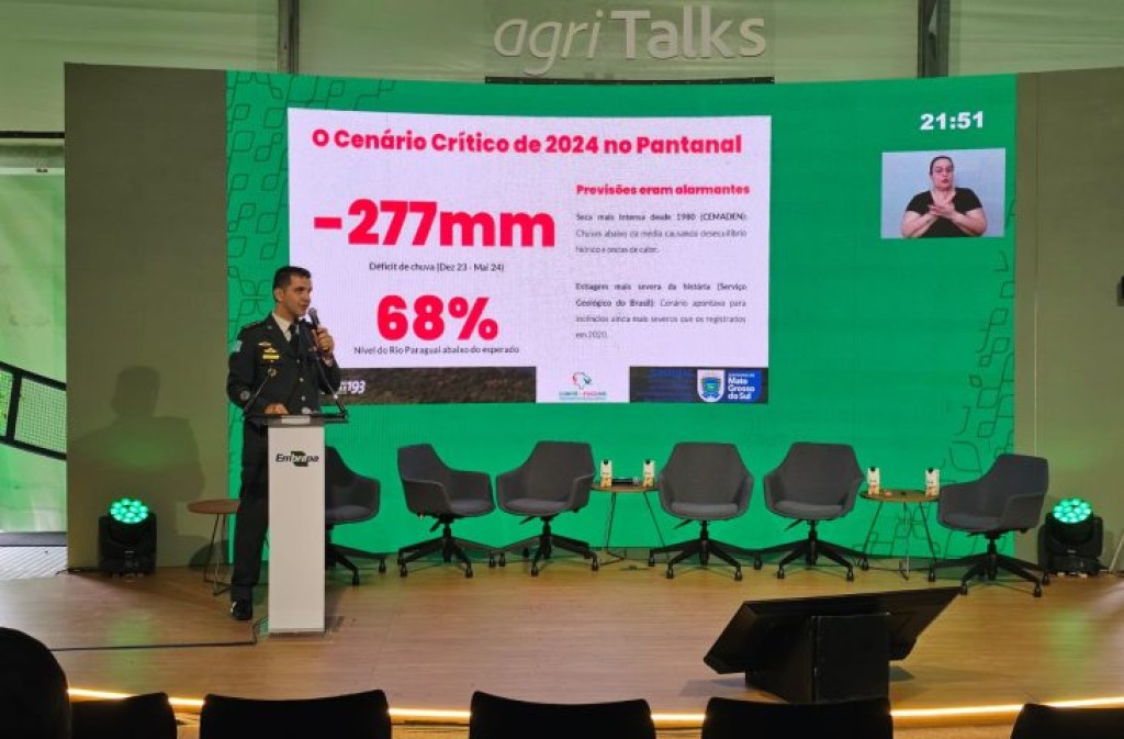Durante a apresentação, ele destacou os desafios decorrentes da seca extrema, a urgência da situação em 2024 e a perda histórica de superfície de água no Pantanal.