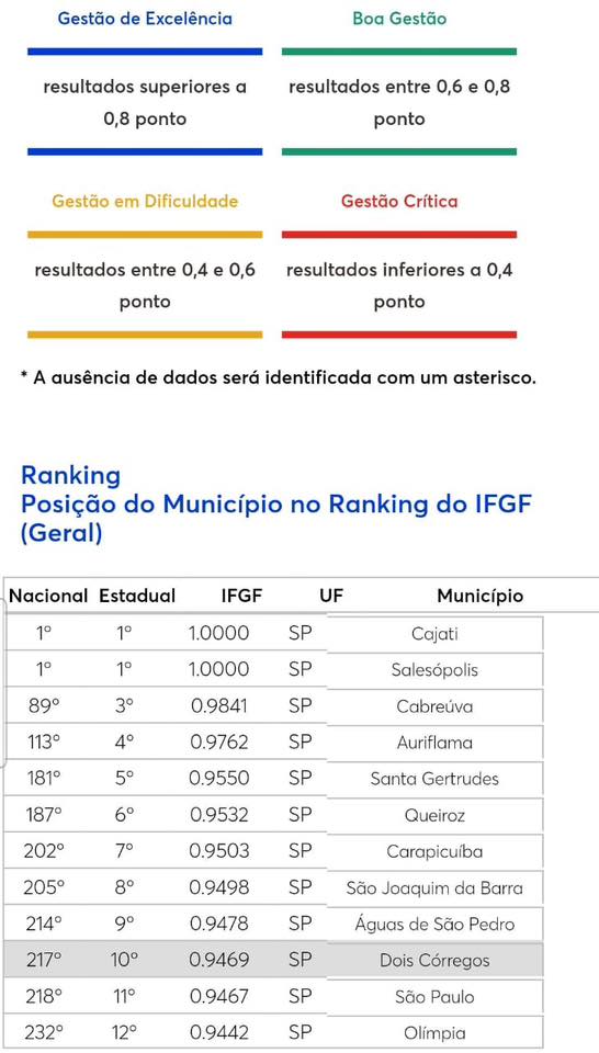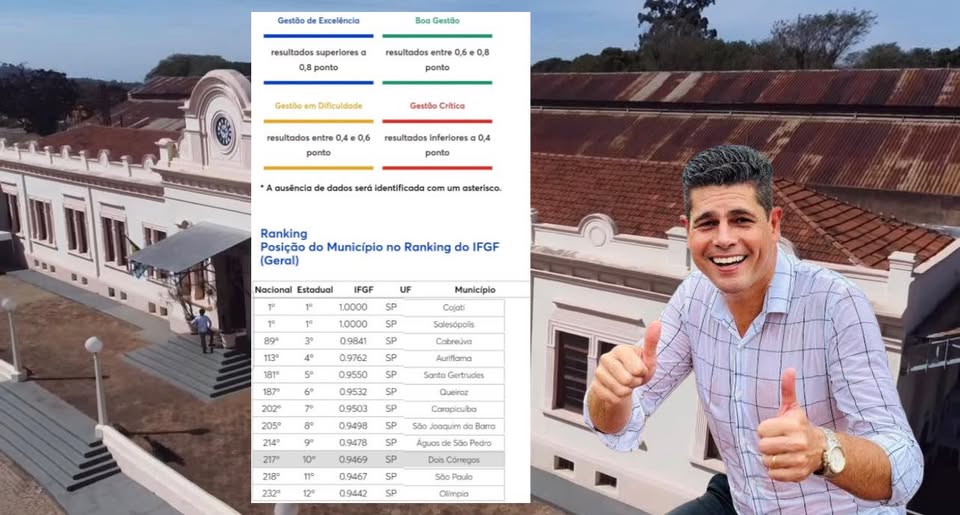 Dois Córregos ganhou destaque estadual e deixou muita gente de boca aberta. Sob o comando do ex-gestor Ruy Favaro, o município alcançou a 10ª colocação no Índice Firjan de Gestão Fiscal (IFGF) de 2024, superando até a cidade de São Paulo, a Capital do Estado.