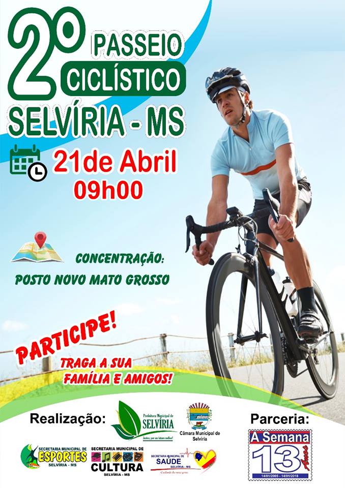 No próximo dia 21, acontecerá em Selvíria, o 2º Passeio Ciclístico, com concentração no Posto Novo Mato Grosso, e início às 09h. O evento será realizado através da Prefeitura e Câmara Municipal, e Secretarias de Esportes e Lazer, de Cultura e de Saúde, em parceria com o jornal A Semana.