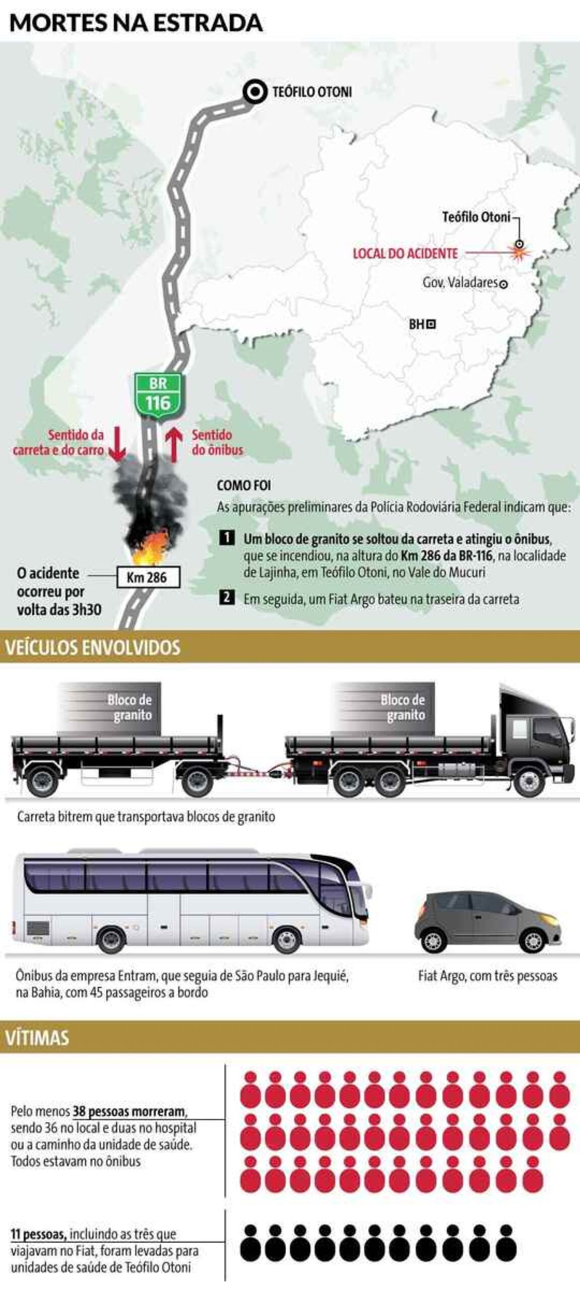 Na madrugada do último sábado (21), um grave acidente na BR-116, em Minas Gerais, resultou na morte de 41 pessoas e deixou diversas outras feridas. O acidente ocorreu quando um bloco de granito, transportado por uma carreta, se desprendeu e atingiu um ônibus de viagem que seguia no sentido contrário. Após o impacto, o ônibus incendiou. Um terceiro veículo, um carro de passeio, também se envolveu no acidente, deixando três ocupantes gravemente feridos.