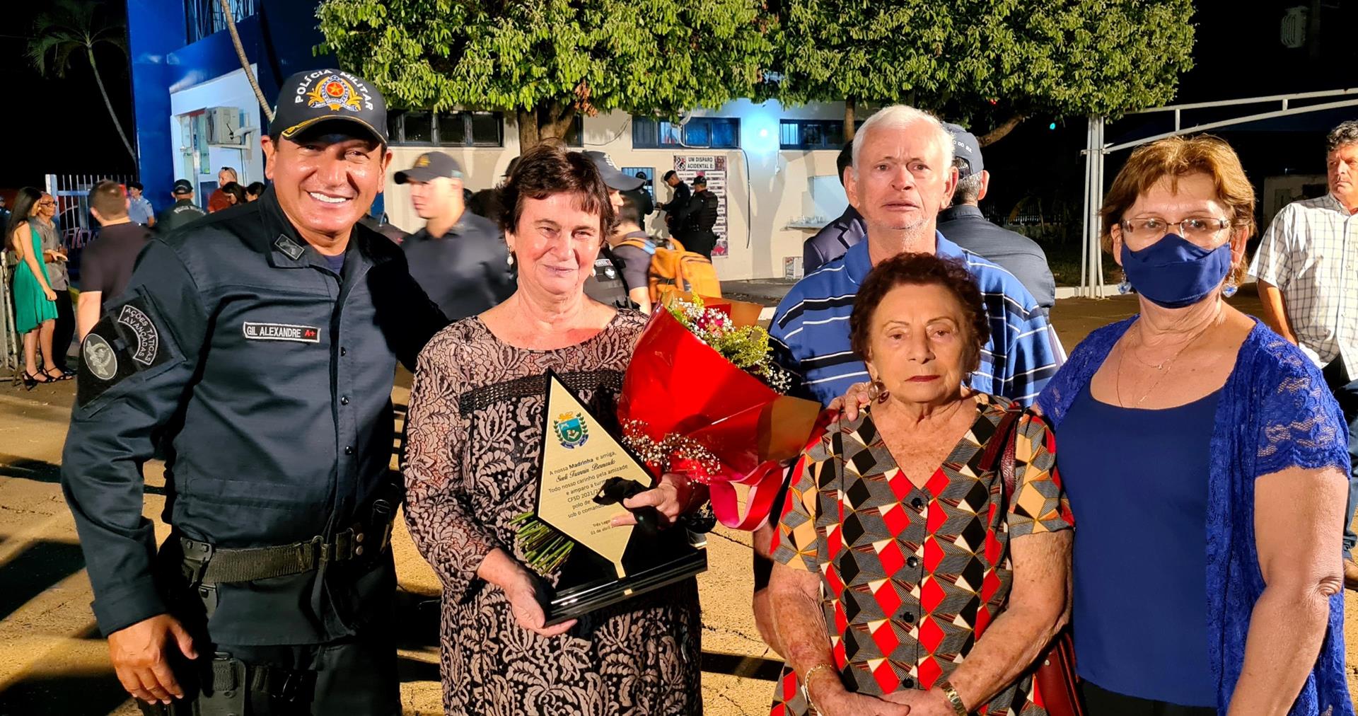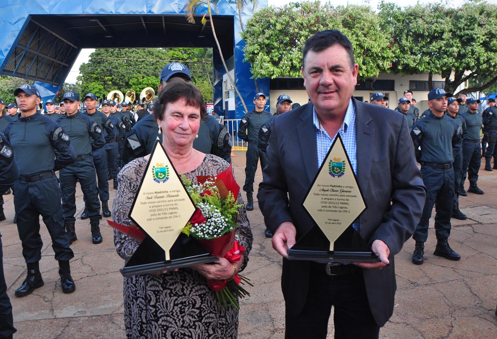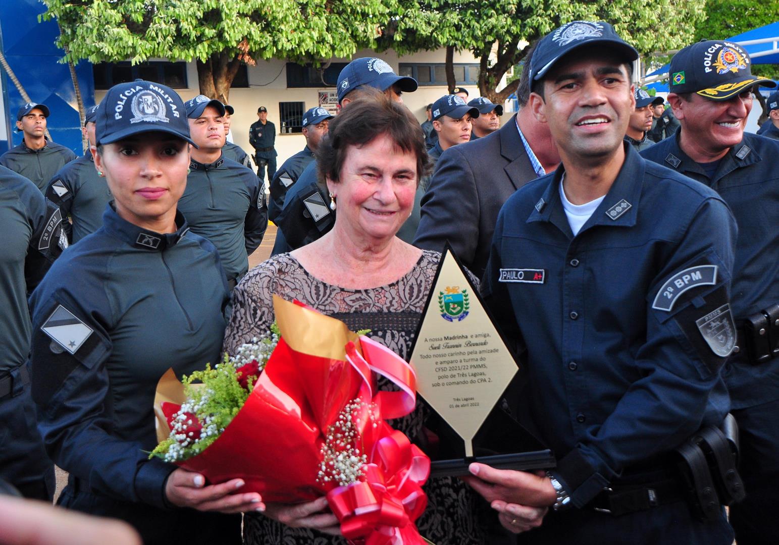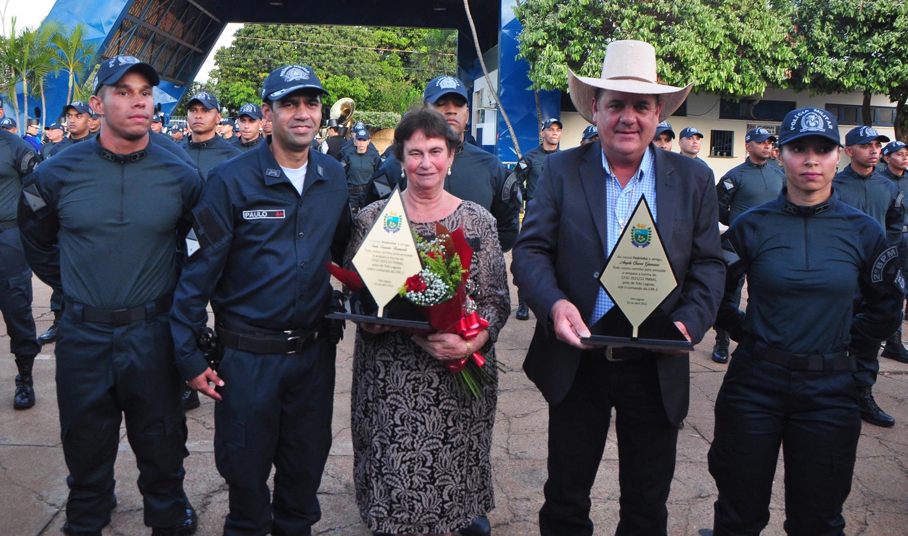 Madrinha de honra da 36º Turma, Sueli Trannin foi homenageada na cerimônia, juntamente com o Padrinho o Prefeito de Três Lagoas Angelo Chaves Guerreiro, o Diretor do Polo de ensino Coronel QOPM Gil Alexandre da Rocha e o Subdiretor TC QPPM Paulo Ribeiro dos Santos.