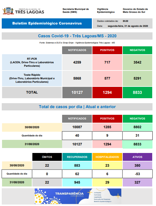 A Prefeitura de Três Lagoas, por meio do setor de Vigilância Epidemiológica da Secretaria Municipal de Saúde (SMS), divulgou o Boletim Epidemiológico COVID-19 desta segunda-feira (31).
