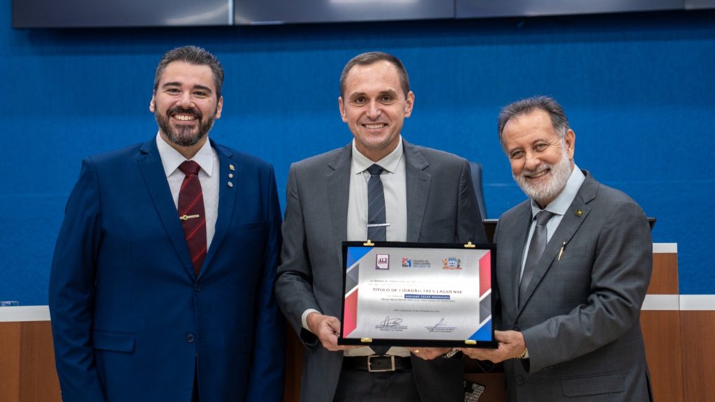 Entre os agraciados, o vereador Sargento Rodrigues recebeu Título de Cidadão Três-lagoense, proposto por Daniel da Farmácia